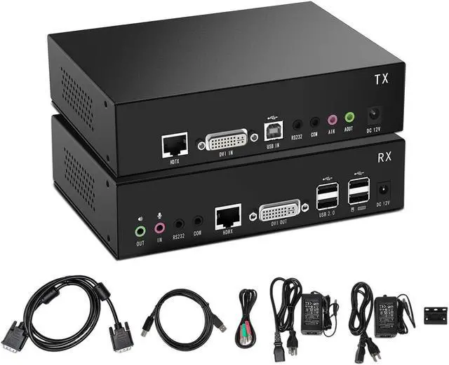 Package Contents: 1x Transmitter, 1x Receiver, 1x DVI-D cable, 1×Audio/Mic cable, 1×USB cable, 2x Power Adapter, 1xRack Ear, and 1xUser Manual. 2-Year Warranty.