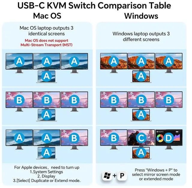 MST USB C+HDMI KVMSimply connect 1 HDMI cable +1 Type-C cable between laptop and USB-C KVM switch, and you can display 2 different screens on 3 HDMI monitors (Copy or extend). The USB-C port of the MST USB-C switch 1 in 2 out is fully functional. Make sure your laptop has display expansion features.