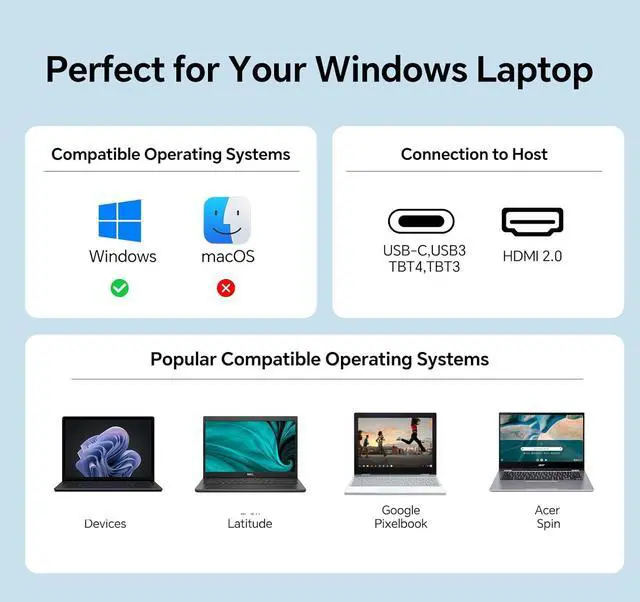 NOTE: 1. Support PD 87W to power laptops. Please connect the 220V power supply to the KVM PD port; 2. USB C interface of your device must support Thunderbolt 3 or above standards to use it; 3.Windows can support extended mode ABC with three different screens. Apple Mac computers do not support extended mode, only copy mode. Those who mind should buy with caution; 4.Laptop must have both USB-C +HDMI ports; 5.If you experience screen flickering, a blue screen, or a black screen during use, press the rocker switch and power cycle, try replacing the USB-C cable, or lower the monitor resolution to ensure a smooth image.