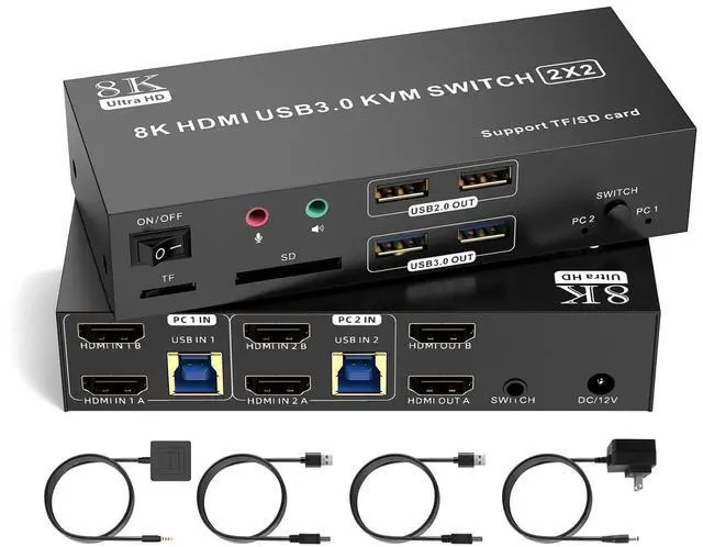 4xUSB 3.0 + Audio Jack + SD/TF Card Reader:This 2 computers 2 monitors kvm switch features four high-speed USB 3.0 ports, a dedicated microphone/headphone jack, and a built-in SD/TF card reader. Effortlessly connect peripherals including external hard drives, printers, microphones and headphones, while enjoying seamless memory card access - eliminating adapter clutter for a streamlined and productive workspace