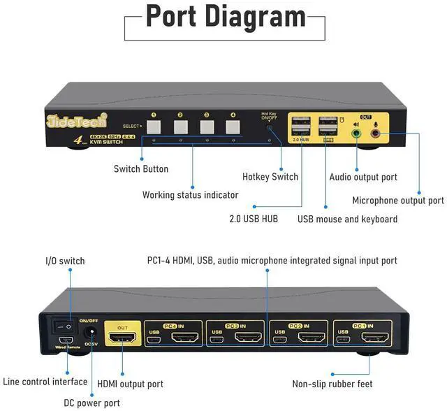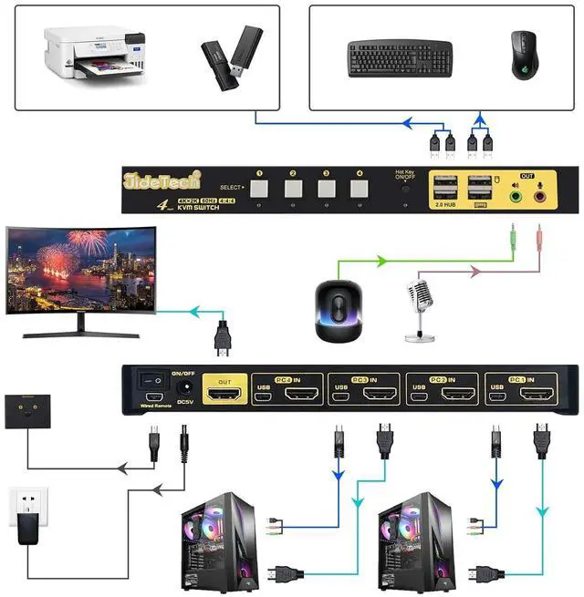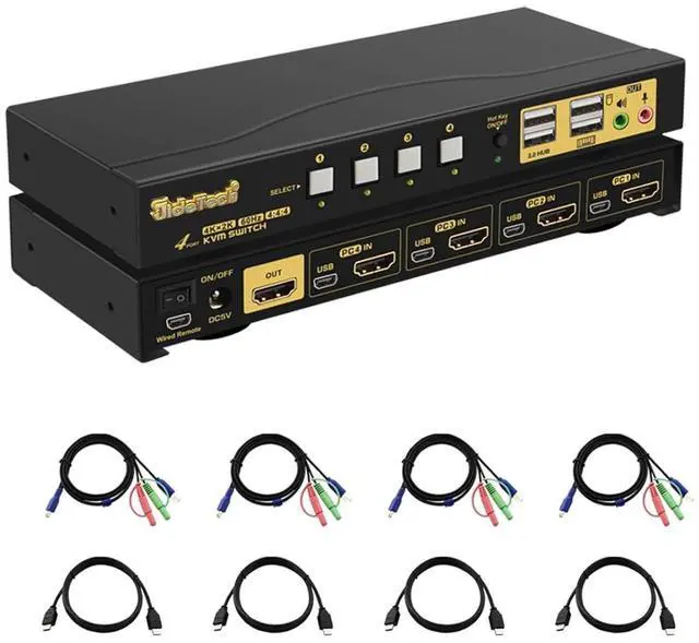 4 PORT HDMI KVM SWITCH: One set USB keyboard & mouse console controls 4 HDMI devices: PC / Servers / Hard disk / NVR / Game consoles / AppleTV, etc. With 2 USB-hub ports for sharing external hard drives, printers, scanners, etc.Experience the convenience and efficiency of multi-device management
