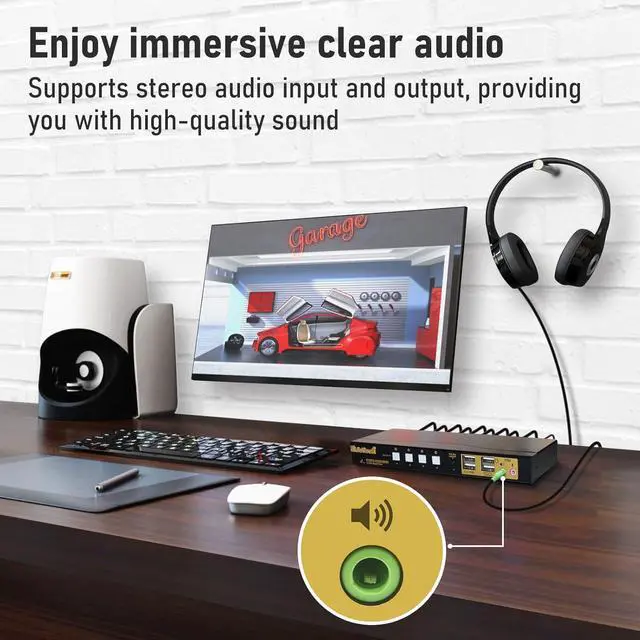 ENJOY IMMERSIVE SOUND: The 4K Monitor KVM Switch is equipped with 3.5mm microphone and speaker ports for audio input and output, providing high-quality sound for connected devices. You can plug 3.5mm jack devices into the L/R ports and enjoy clear audio without any distortion or interference