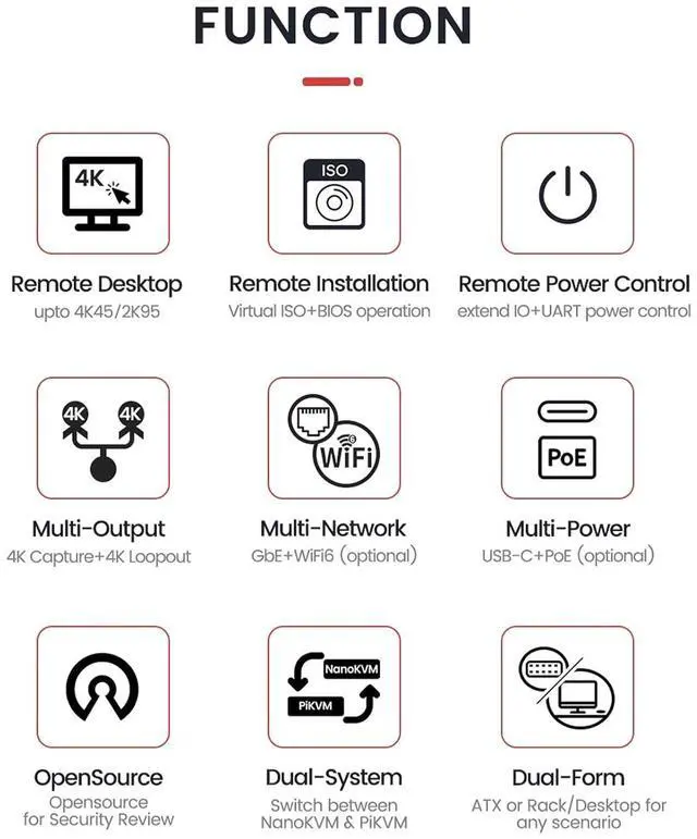 Total Remote Control & Deployment Features Virtual Media to boot from network-mounted ISO images, emulated USB keyboard/mouse, and ATX power control (on/off/reset) via an add-on board. Manage your servers from anywhere as if you were physically present.