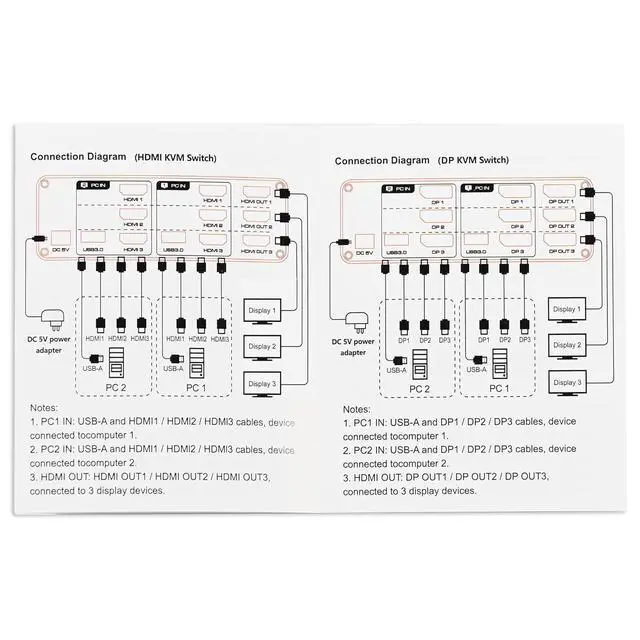 Easy Operation: KVM Switch is compatible with Windows/Linux/Unix/Mac systems. Easily switch between two computers via the button on the switch box or the included wired remote control (Note: Each computer requires 3 HDMI cables to connect with the KVM switch for normal output, and your computer must support multi-screen display)
