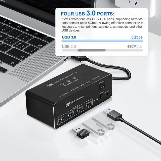 Four USB 3.0 Ports: KVM Switch features 4 USB 3.0 ports, supporting ultra-fast data transfer up to 5Gbps, allowing effortless connection to keyboards, mice, printers, scanners, gamepads, and other USB devices
