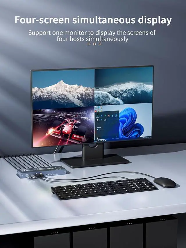 4 Port HDMI KVM SwitchThe HDMI kvm switch 4 port allows 4 computers to share one monitor and 4 USB 3.0 devices, One set of keyboard and mouse to control 4 computers at the same time. Support mouse crossing & roaming in 4 Equal Screen Mode. avoid frequently plugging and boosts office efficiency