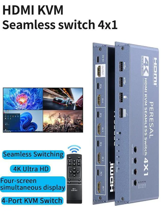 KVM Control and Remote ControlSupport Button + Remote + Hot-key seamless switching. 4x1 Quad Multi-Viewer with function buttons and attached IR remote control, suitable for remote control.