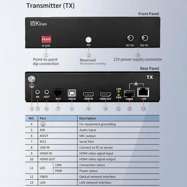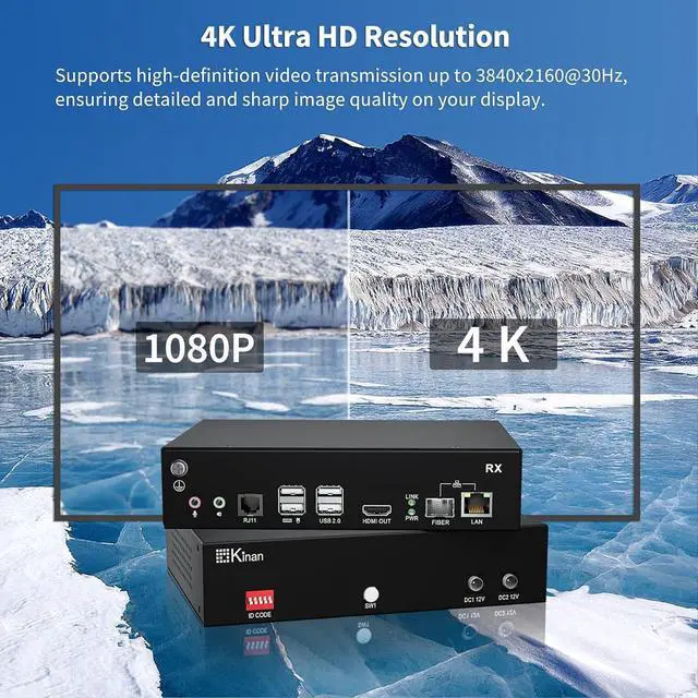 4K KVM USB HDMI Extender Over Fiber or CAT5E, this device expertly extends your computer's HDMI video, USB 2.0, keyboard, mouse, audio, and serial port signals over incredible distances. Utilizing either a standard CAT5e/6 network cable or fiber optic cable, it achieves transmission up to 150 meters over LAN, 300 meters via multi-mode fiber, or an impressive 10 kilometers with single-mode fiber, freeing you from location constraints. NOTE: The bandwidth of the optical module must reach 1.25Gbit/sec.