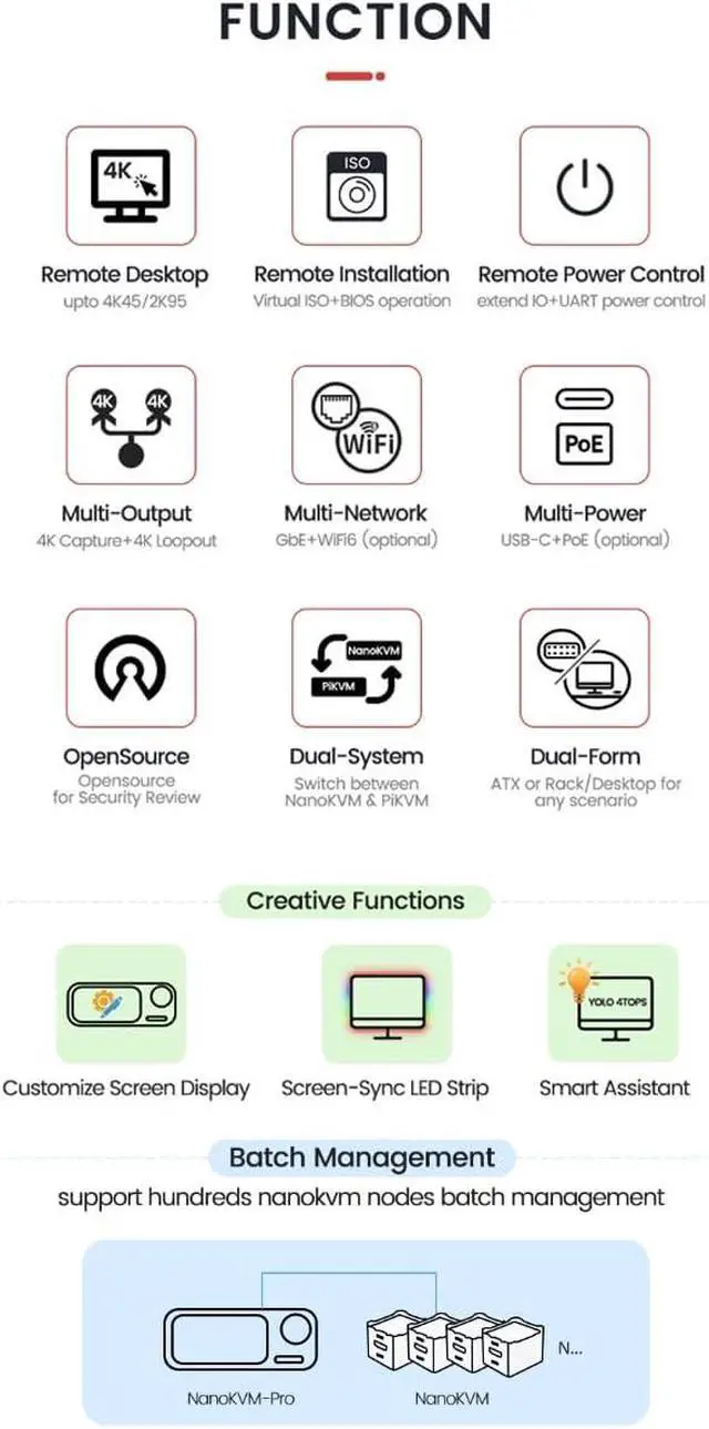 [Remote Control O&M Server] Sipeed NanoKVM Pro IP-KVM Mini Remote Control O&M Server is an IP-KVM product based on AX631 2xA53 1.5G CPU Linux Single Board Computer, provides robust computational support for remote desktop connections. It supports MJPEG/H264(WIP)/H265 video encoding, 4K 45fps/2K 95fps/1080P 60fps resolution, 60~100ms video latency, 1000M/100M/10M Gbe Gigabit Ethernet port on board, Size: 65x65x26mm.
