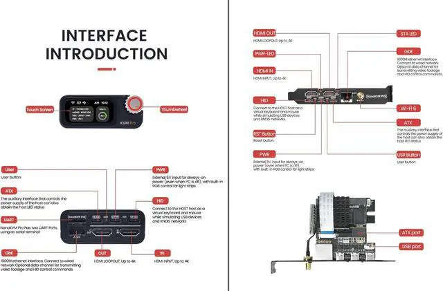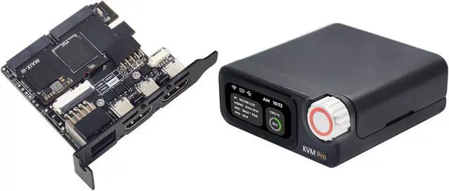 [Meet the Different Needs of Users] Sipeed NanoKVM Pro IP KVM remote control server currently provides two versions: NanoKVM-Desk is the desktop version of NanoKVM Pro. Its main body features a matte metal casing, with a 1.47-inch touchscreen on the front panel displaying KVM core information. This screen allows for convenient hardware function setup or serves as a mini secondary display. NanoKVM-ATX is the chassis-integrated version of NanoKVM Pro. Its built-in USB cables and power control interfaces simplify installation for host users. Remote control is achieved by connecting external HDMI, Ethernet, and USB cables.