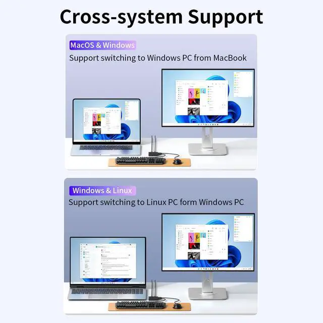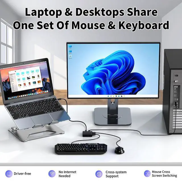 Wide Compatibility Across Systems: Supports sharing one set of mouse and keyboard between two computers running different operating systems, such as macOS, Windows, Linux, HarmonyOS, and more.