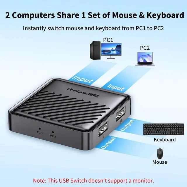 Laptop & Desktop Share One Set of Mouse & Keyboard: The UnnLink USB-C Switch allows one laptop and one desktop to share a single set of mouse and keyboard, enabling seamless switching between work and personal computers to enhance productivity. (*This is not a KVM switch and does not support display or video transmission.*)