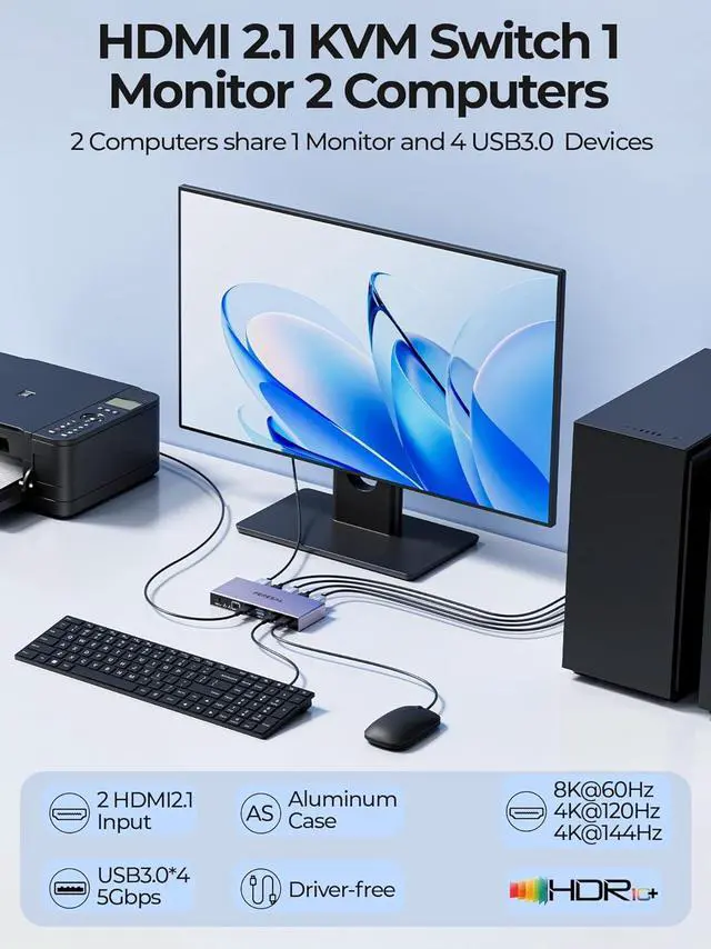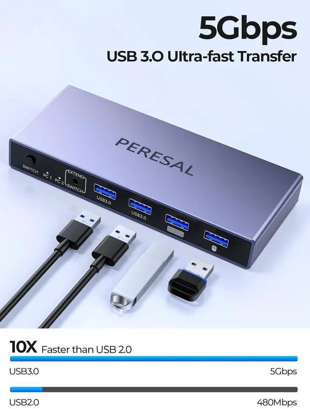 5Gbps Transfer SpeedThis HDMI USB switcher for 2 computers has 4 USB 3.0 ports to share mouse, keyboard, USB flash drive, printer, etc. The USB 3.0 ports transfer data up to 5Gbps(10x faster than USB 2.0), Faster transfer of pictures, files, etc.