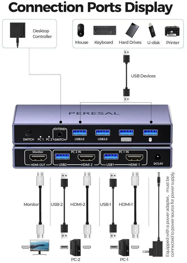 Package Contents1 x USB HDMI KVM Switch, 2 x USB A to A cables, 1 x Desktop Controller, 1 x DC 5V Power Adapter, 1 x User Manual. Please contact us if you have any questions before purchase or during use. We provide 24H customer friendly support service.