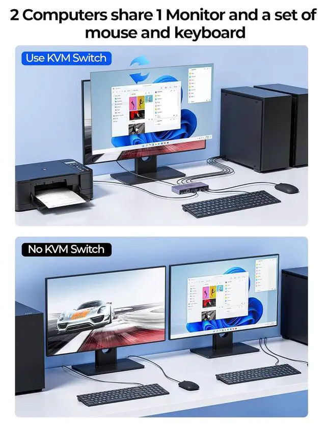 8K@60Hz HD OutputThis display port kvm switch supports up to 8K@60Hz 4K@240Hz, allowing you to enjoy realistic and colorful visual effects. Note: To achieve 8K output, you need to connect the cable supporting up to 8K output. And make sure the resolution of the input and output are the same.