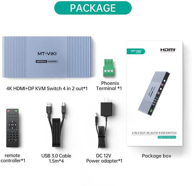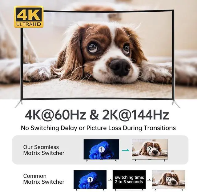 KVM Switch for 4 computers 2 monitors Supports resolutions up to 4Kx2K@60Hz, 3D, Full HD 1080P, deep color 36 bit. Built-with 2 USB 1.1 for Keyboard and mouse, one USB 2.0 &USB 3.0 for USB Devices. (Pls help to confirm that the output cable is above HDMI 2.0, and the input & output device must support 4K@60Hz, otherwise , it can't output 4K@60Hz resolution)
