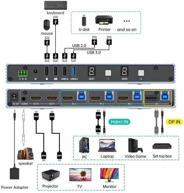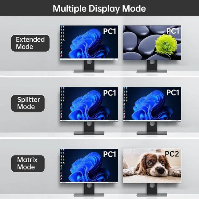 HDMI+DP Matrix KVM SwitchThe 4K 4x2 HDMI Matrix KVM Switch supports a matrix switch between four input devices (HDMI*3+DP*1) onto two output displays, share one set of keyboard&mouse or other USB Devices. The two output signals can be show matrix mode or extended mode.Pls confirm that your input devices must have 2 connected interface, like HDMI/DP, otherwise it can't support extended mode