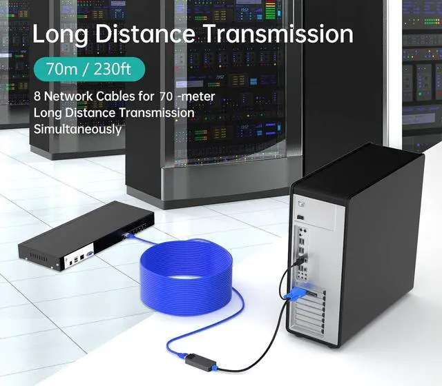 It allows to transmit distance up to 230ft (70m) by connecting a kvm swtich usb server interface unit to cat5e kvm switch over Cat6 Ethernet cables.
