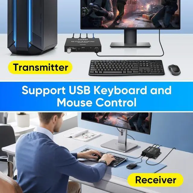 Support KVM USB Extend and IR Remote ControlOur HDMI USB KVM extender receiver with 2 USB2.0 ports, which can allow you to control a computer system through keyboard and mouse. By transmitting keyboard and mouse data via a LAN cable, and you can easily control the signal source, ideal for remote control of devices such as computer, monitors and so on.Support 20~60KHz wide Frequency IR signal transmission for controlling the source device
