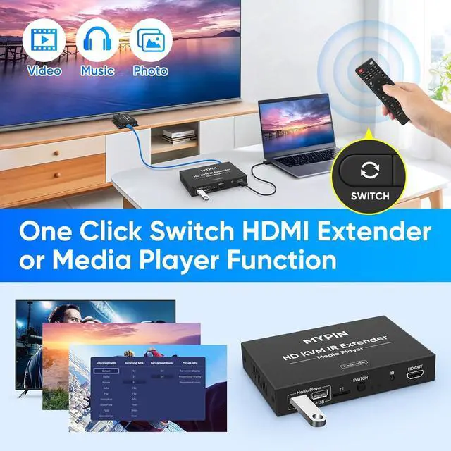 Multi Functional Media PlayerThis is not only a HDMI KVM USB Extender, but also a media player. supports H.265/HEVC decoding technology ,Compared with H.264 decoding and 1080P resolution etc.Support play music,photo, videosPPT from a USB flash drives or TF card,2-port USB, supporting USB drive(up to 512G )or hard drives (up to 14TB) , Support Automatic video playback with endless repeat and looping, and the ability to resume from the last stopping point.Suitable for digital signage applications,partyhome theaters and office work.