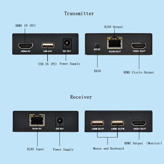 KVM Function - The Receiver(RX) has 2 USB output ports, you can use it to connect keyboard and mouse, and control the remote computer connected to the Transmitter(TX). Note: The USB output port does not support U disk.
