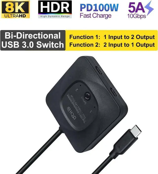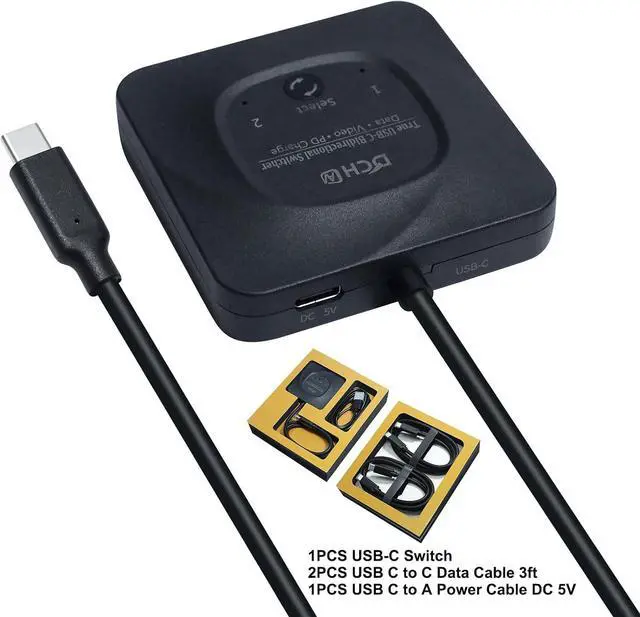 One push button toggle between 2 PCs avoids repeat plugging and plugging; LEDs indicator for knowing which computer is active; Driver free, easy to use; USB 3.0 Gen 2 cables are included (USB3.0 C male to C male, C male to A male)