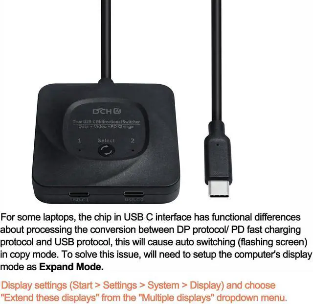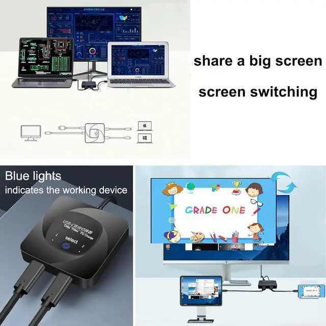 Bi-directional USB C switch selector enables 2 USB-C computers to share 1 peripheral devices (as 2 in 1 out USB C KVM switch), or access 2 separate displays from 1 laptop (as 1 in 2 out USB C splitter)