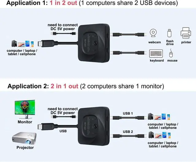 Compact USB switcher 2 port adapter is ideal for sharing multiple devices like printer, scanner, mouse, keyboard, USBc webcam, type c monitor, USB hub KVM docking station, card reader, flash drive between 2 desktop computers / laptops