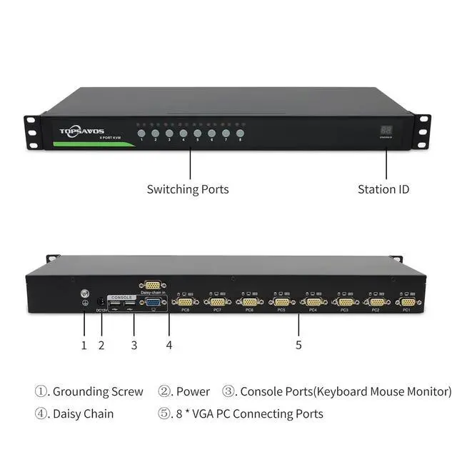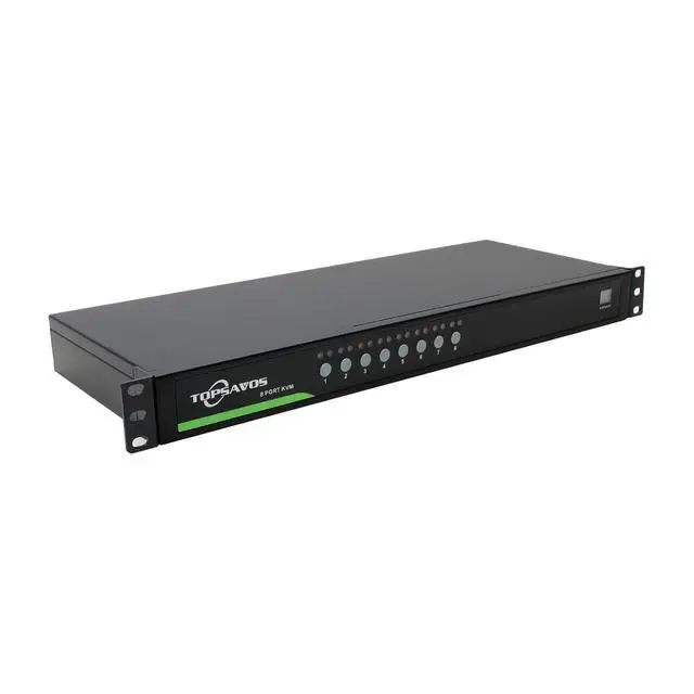 8-Port VGA 1U Rack Mount KVM Switch. This 8-Port VGA 1U Rack Mount KVM Switch enables centralized management of up to 8 servers from a single console. Its space-saving 1U form factor is designed for standard 19-inch racks, ideal for organizing server rooms and data centers. This approach effectively reduces cable clutter and hardware redundancy, simplifying access and improving operational efficiency.