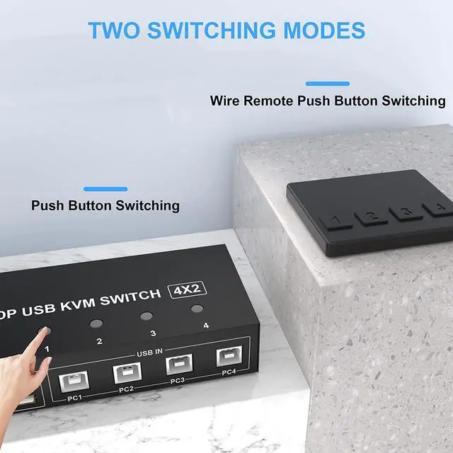 Support 2 Mode Switching1. Buttons switching, just need one click switch to the designated computer2.Wired remote switch (included in the package). LED indicates the active computer. The package comes with an external power adapter, don't need to worry about the low power.
