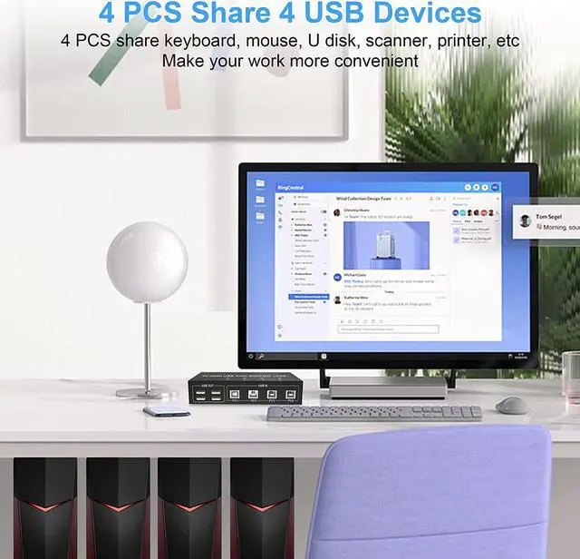 USB2.0 interface 4 PCs 2 MonitorsThe dual monitor switch has 4 USB 2.0 ports, allows you to share 4 more USB peripherals like keyboard, mouse, printer, scanner, webcam and hard disk between 4 computers. It identify and match various display devices automatically. Compatible with a variety of computer systems,such as Windows 10/7/2000 / XP / VistaLinuxUnixMacUbuntuFedora,etc. Plug and play, no external power required.