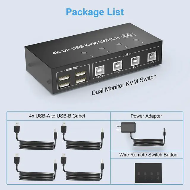 Important notesOnly when your computer supports dual display or multi-display, you can use this product to achieve 4 computers to share two monitors, extended mode or copy mode. If your computer only supports a single display, then this product cannot help you get a dual display function. Package includes 1 x 4 port Dual Monitor KVM Switch, 1 x Power adapter, 1 x Wired Remote Switch, 4 x USB Type-A to B cable, and 1 x User Manual. We offer a 2-year warranty.