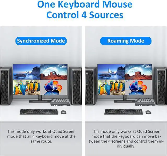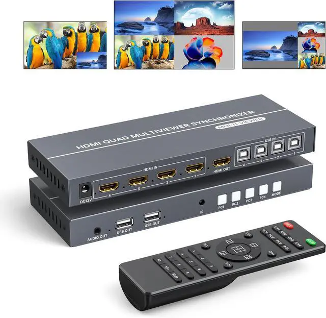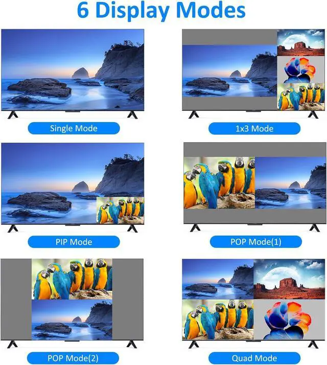 Works as 4x1 MultiviewerThis Quad KVM Switcher can allow 1 monitor displaying 4 sources simutaneously or individually, with 6 Display Modes:Single mode, 1x3 mode, PIP mode, POP mode(1), POP mode(2) and Quad mode