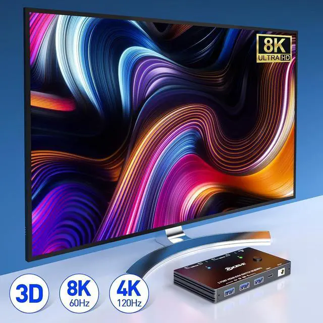 Great Compatibility & 2 Switching MethdosHDMI2.1 KVM Switch driver-free, plug and play. Pressing the button on the panel or use the wired remote controller 4.92ftincluded in the package to switch the computers.Two color indicate lights the active computer.