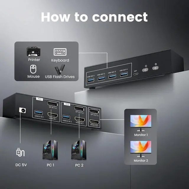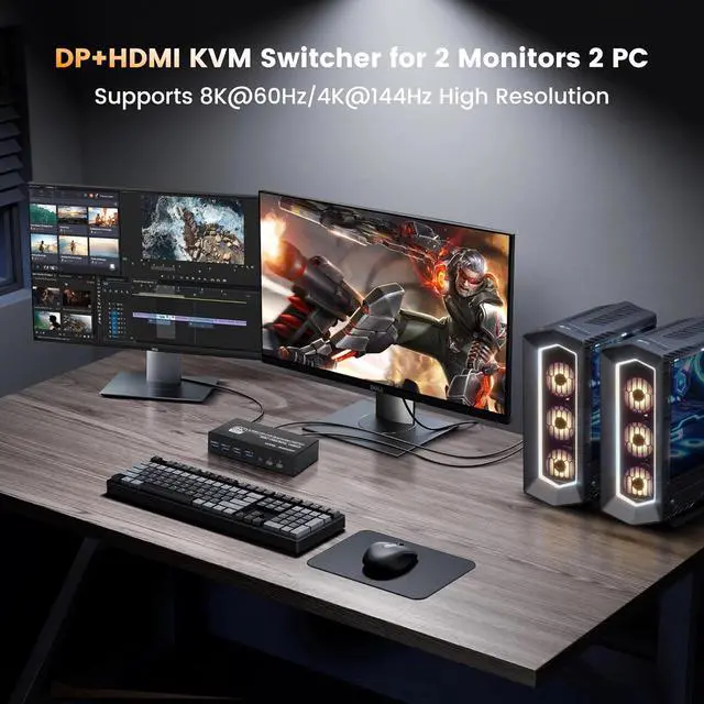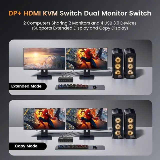 KVM Switch for 2 Monitors & 2 Computers 8K@60Hz KVM switch control two computers across two monitors (1×DP + 1×HDMI) with one keyboard/mouse. Features 4 USB 3.0 ports to share printers, drives, and peripherals. The 2x2 HDMI KVM switcher supports extended and Copy modes.