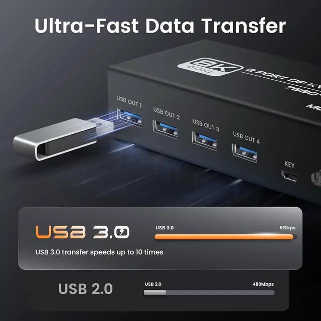 High-Performance Connectivity This dual monitor KVM switch features 4 USB 3.0 ports (5Gbps transfer speed) for seamless sharing of peripherals including mice, keyboards, printers, and storage devices. The USB 3.0 standard delivers 10x faster data transfer compared to USB 2.0, while maintaining backward compatibility with older USB 2.0/1.1 devices.The kvm switch comes with a 5V1A power adapter that provides increased drive power and ensures a stable operating environment for each device.