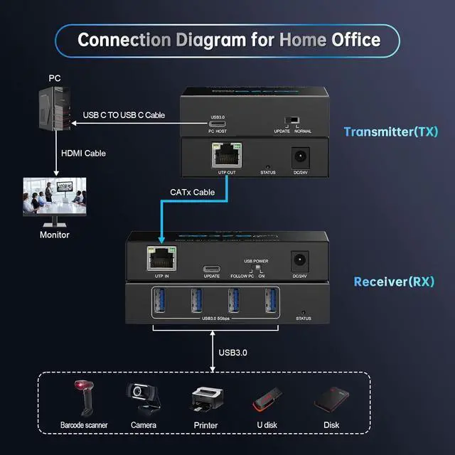 4-Port USB3.0 Hub & 5Gbps Speed Connect multiple devices (cameras, printers, hard drives) to the receiver with 4 USB3.0 ports, supporting blazing-fast 5Gbps data transfer.