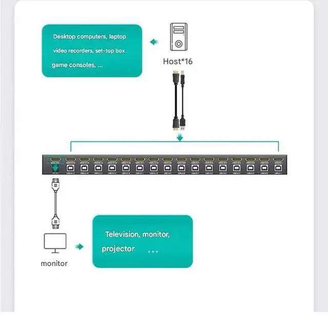 USB/HDMI SwitchThis 16 Ports HDMI Switch Allow to connect any HDMI source devices to One HD TV/HD monitor or projector and easily switch via IR remote , offering clear and delicate display.