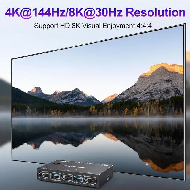• DP USB Switch for 4K@144Hz Visual EnjoymentKCEVE KVM switch DisplayPor 2 ports compliant with DisplayPort 1.4. Our USB displayport switch supports high resolution up to 4K@144Hz, 4K@60Hz, 1920x1080@165hz, makes the screen display more delicate and realistic. The final resolution also depends on the monitor, graphics card, cables and adap