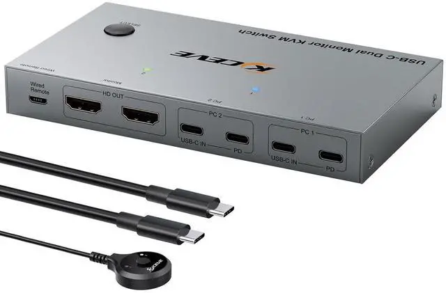 2 fast and efficient switching methodsUSB C Switch 2 PC 2 monitor Switch freely between 2 laptops via a button switch or a 1.5m wired remote control (included). The LED light indicates which laptop is being operated. KVM Switch USB C 2 in 2 out is the first choice for offices and homes. Enjoy the convenience of switching between work, life, and entertainment with Dual Monitor KVM Switch USB C