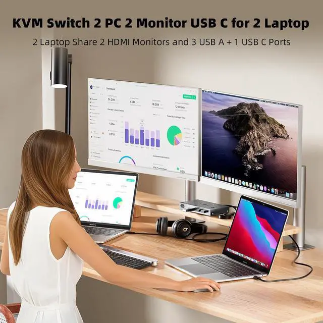 KVM Switch 2 Monitor 2 Laptops USB CKCEVE KVM Switch 2 monitors 2 computers enables 2 USB C laptops to be controlled with 1 set of mouse and keyboard, compatible with printers and scanners, and displayed on 2 HDMI monitors. Press "Windows+P" to select mirror mode or extended screen mode, splicing wall mode