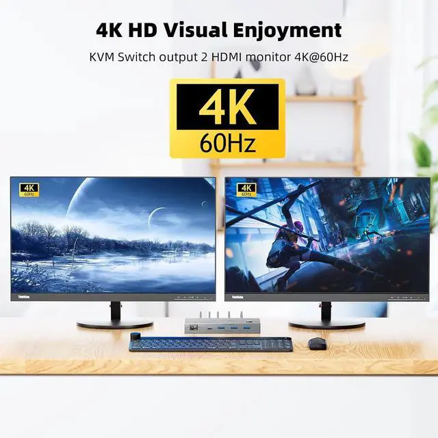 Dual Monitor KVM Switch HDMI supports 4K@60HzUSB C KVM Switch 2 PC connects 2 HDMI monitors with different resolutions, USB C Switch 2 PC 2 Monitor HDMI supports 4K@60Hz. Dual Monitor KVM Supports deep color 4:4:4. Using a short 8K cable will solve the problem of flickering and black screen, the more stable and clear the transmission is