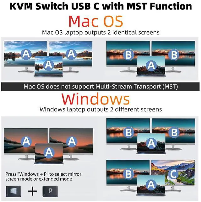 KVM Switch USB C Dock with MSTEach laptop needs to connect 1 Type-C full-function cable to the USB-C KVM switch docking station to display 2 different screens on 2 HDMI monitors. Window laptops support the expansion of 2 different screens. Mac OS laptops can only expand 2 identical screens. KVM Switch 2 PC 2 Monitor USB C supports HDMI 2.0, USB Type-C 3.1 gen 2 standards