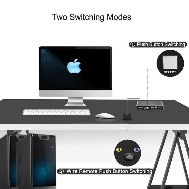 HDMI KVM Switch 2 Port - The 2-Port HDMI KVM Switch enables two HDMI-equipped PCs to share 1 monitor, a keyboard, and mouse, facilitating effortless switching between systems. It helps declutter your workspace and maintain a neat, organized environment.