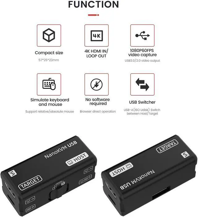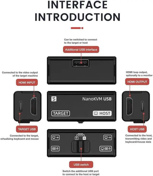 [Description] The NanoKVM-USB enables convenient maintenance and operation of multiple devices without needing a keyboard, mouse, or monitor. It supports direct graphical access via Chrome browser, requiring no extra software.