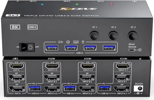 KVM Switch Triple Monitor Ultra HD 8K 3 Monitors KVM Switch Displayport: support resolution up to 8K@30Hz /4K@144Hz, HDMI: support resolution up to 8K@60Hz/4K@120Hz and backward compatible with lower resolution.Note: Final resolution is also subject to graphic cards, monitors, cables and adapters.