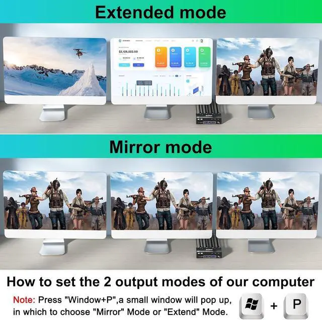 KVM Switch 3 Monitors 3 Computers This 3 computers 3 monitors KVM switch perfect for hooking up 3 desktops /laptops to share one set of wired or wireless keyboard mouse and 3 monitors (supports extended and mirrored display modes). Please note: extended mode can output three different screens and mirror mode can output three identical screens.