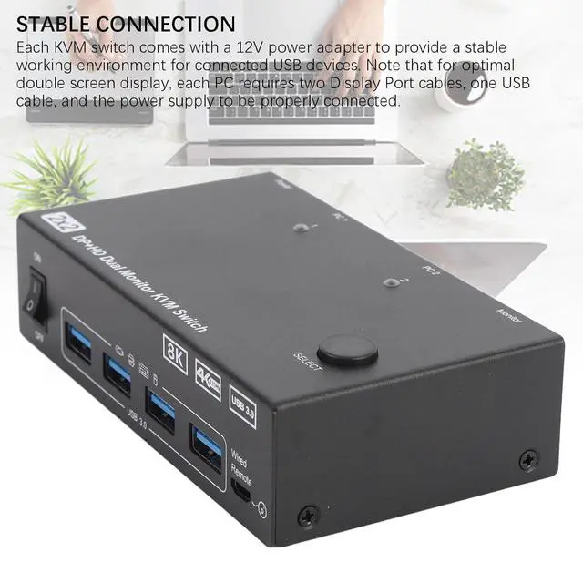 STABLE CONNECTION: Each KVM switch comes with a 12V power adapter to provide a stable working environment for connected USB devices. Note that for optimal double screen display, each PC requires two Display Port cables, one USB cable, and the power supply to be properly connected.