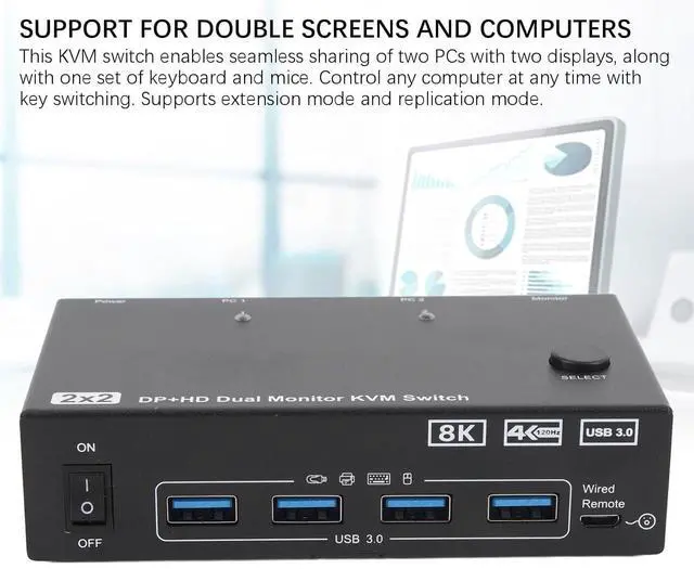 SUPPORT FOR DOUBLE SCREENS AND COMPUTERS: This KVM switch enables seamless sharing of two PCs with two displays, along with one set of keyboard and . Control any computer at any time with key switching. Supports extension mode and replication mode.