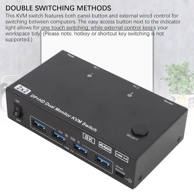 DOUBLE SWITCHING METHODS: This KVM switch features both panel Buttons and external wired control for switching between computers. The easy access Buttons next to the indicator light allows for one touch switching, while external control keeps your workspace tidy. (Please note: hotkey or shortcut key switching is not supported.)